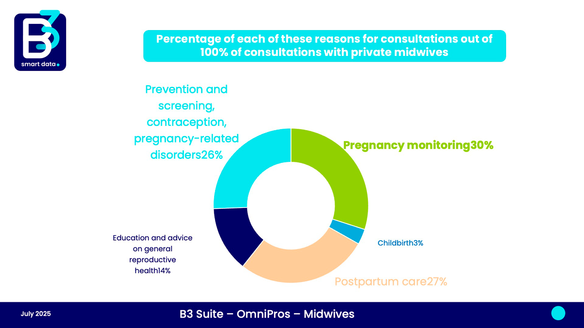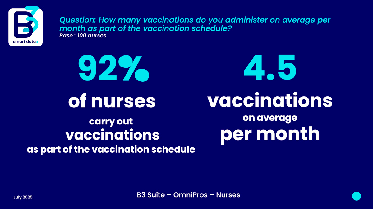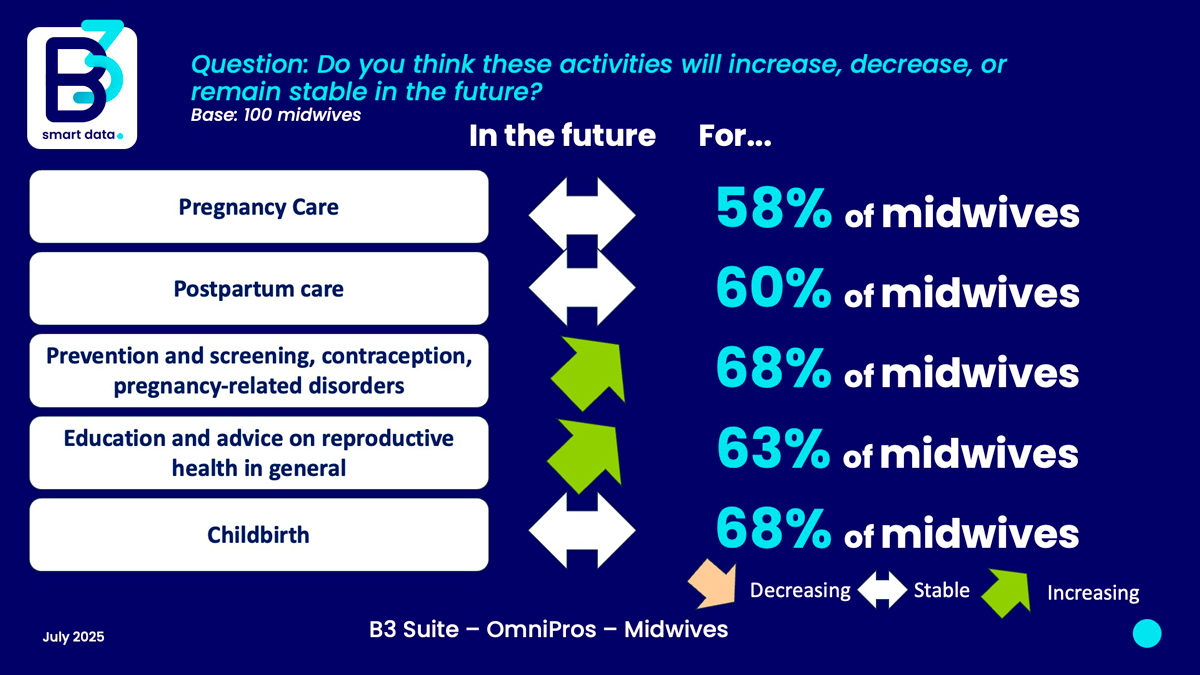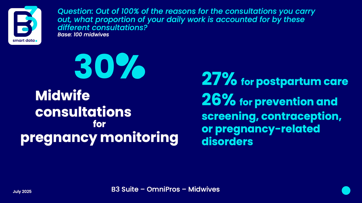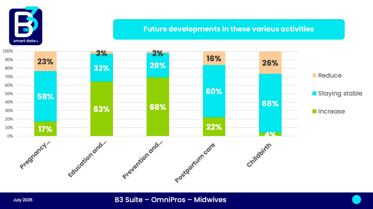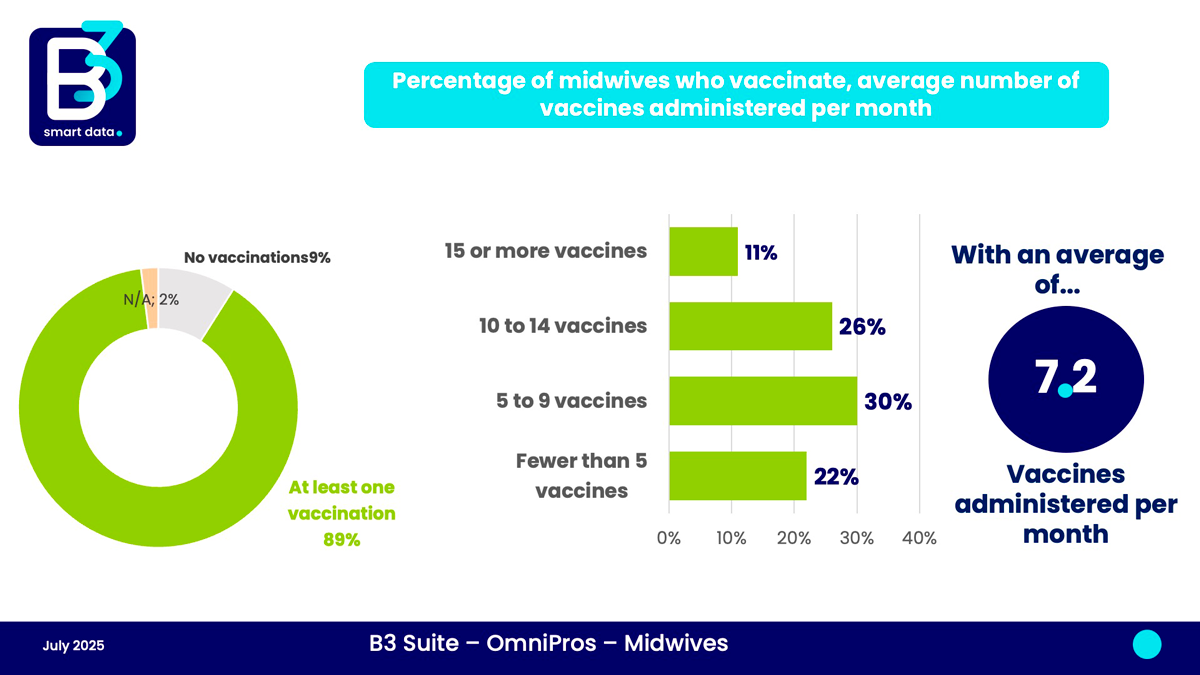 French midwives combine pregnancy monitoring (30%), postpartum care (27%), and prevention activities (26%) in their daily practice. Nearly 9 in 10 administer vaccines, with an average of 7.2 doses per month. Looking ahead, most expect their involvement in prevention and education to keep increasing, underlining their importance in women’s healthcare beyond childbirth alone.
